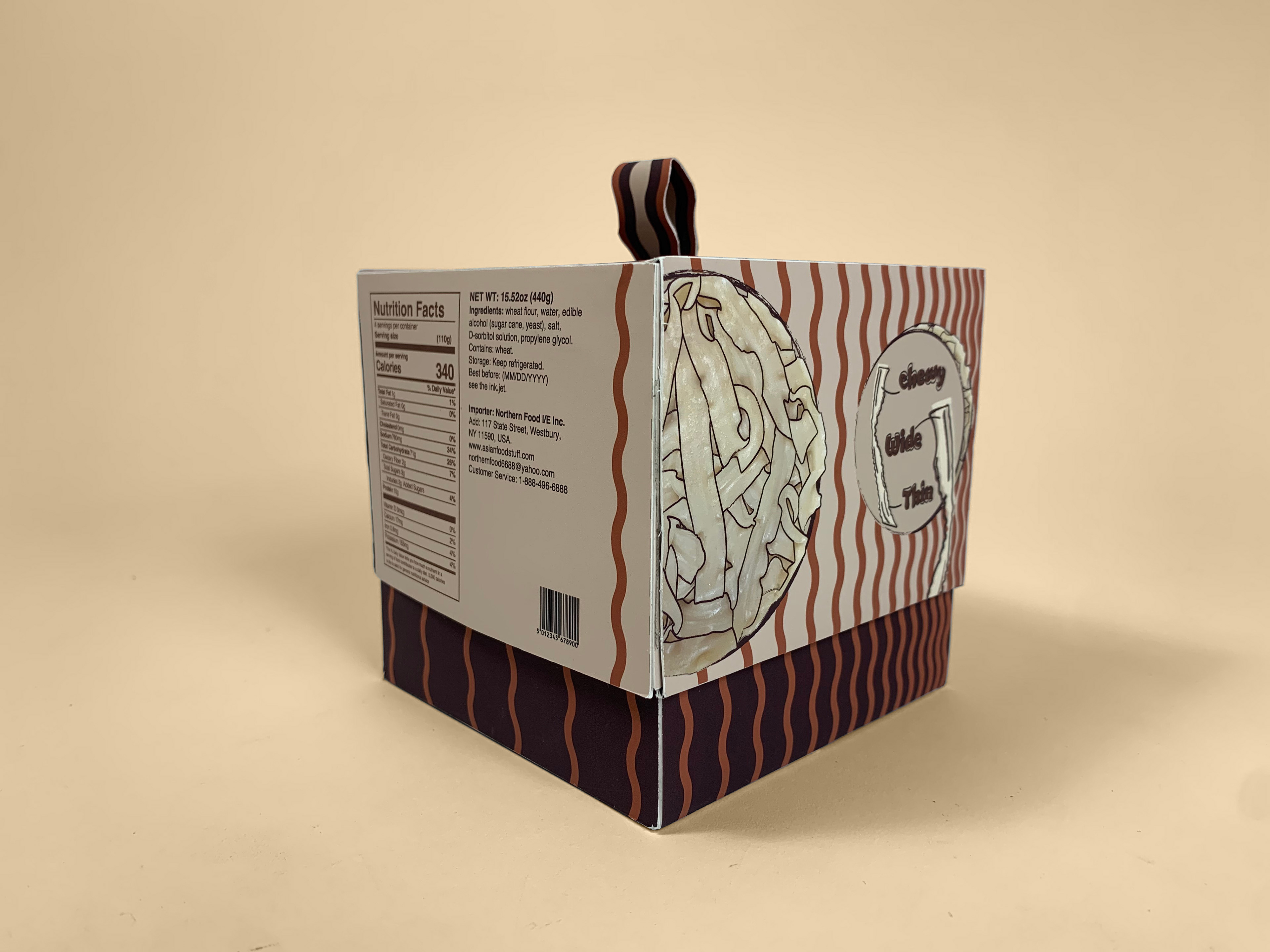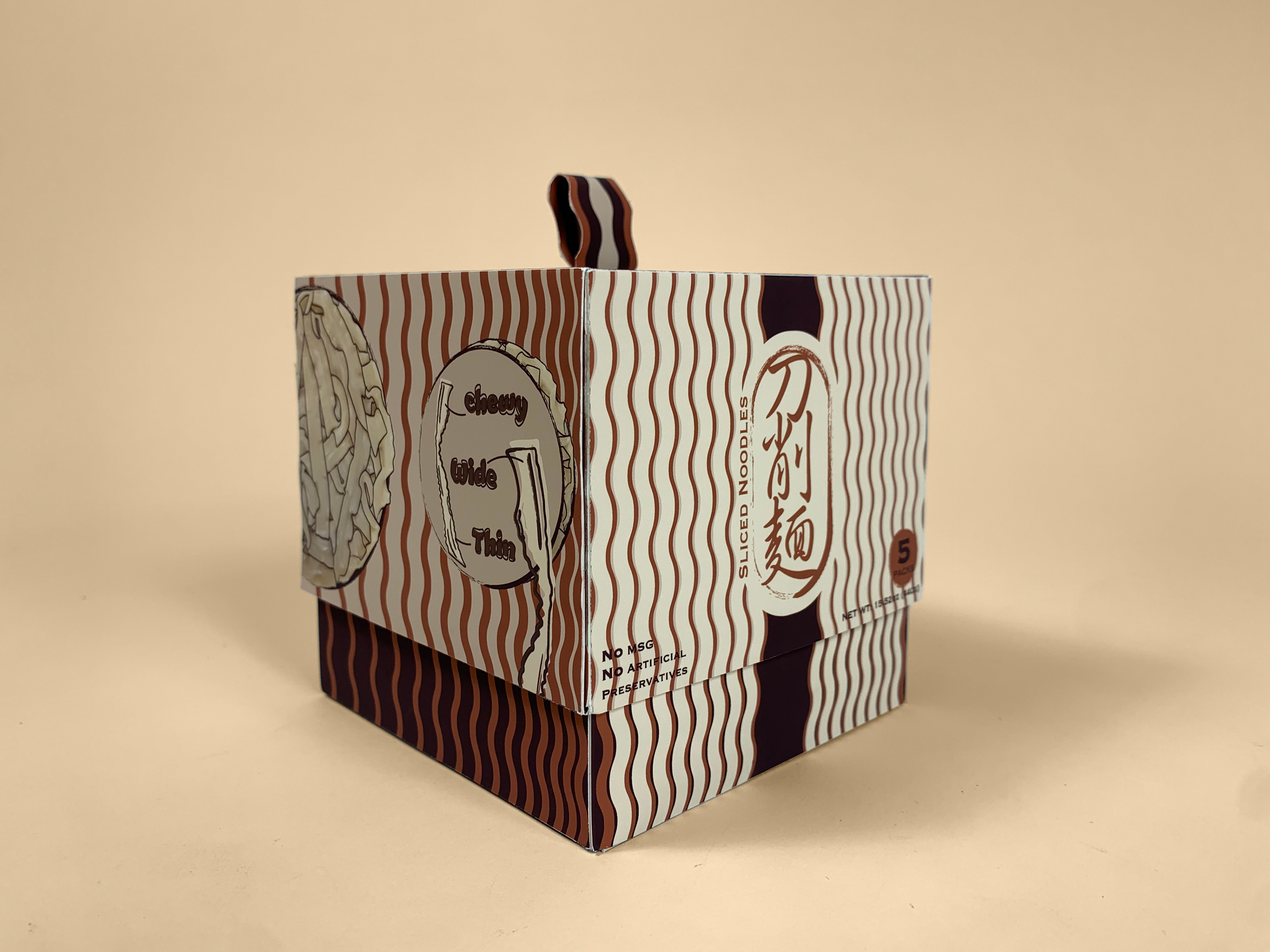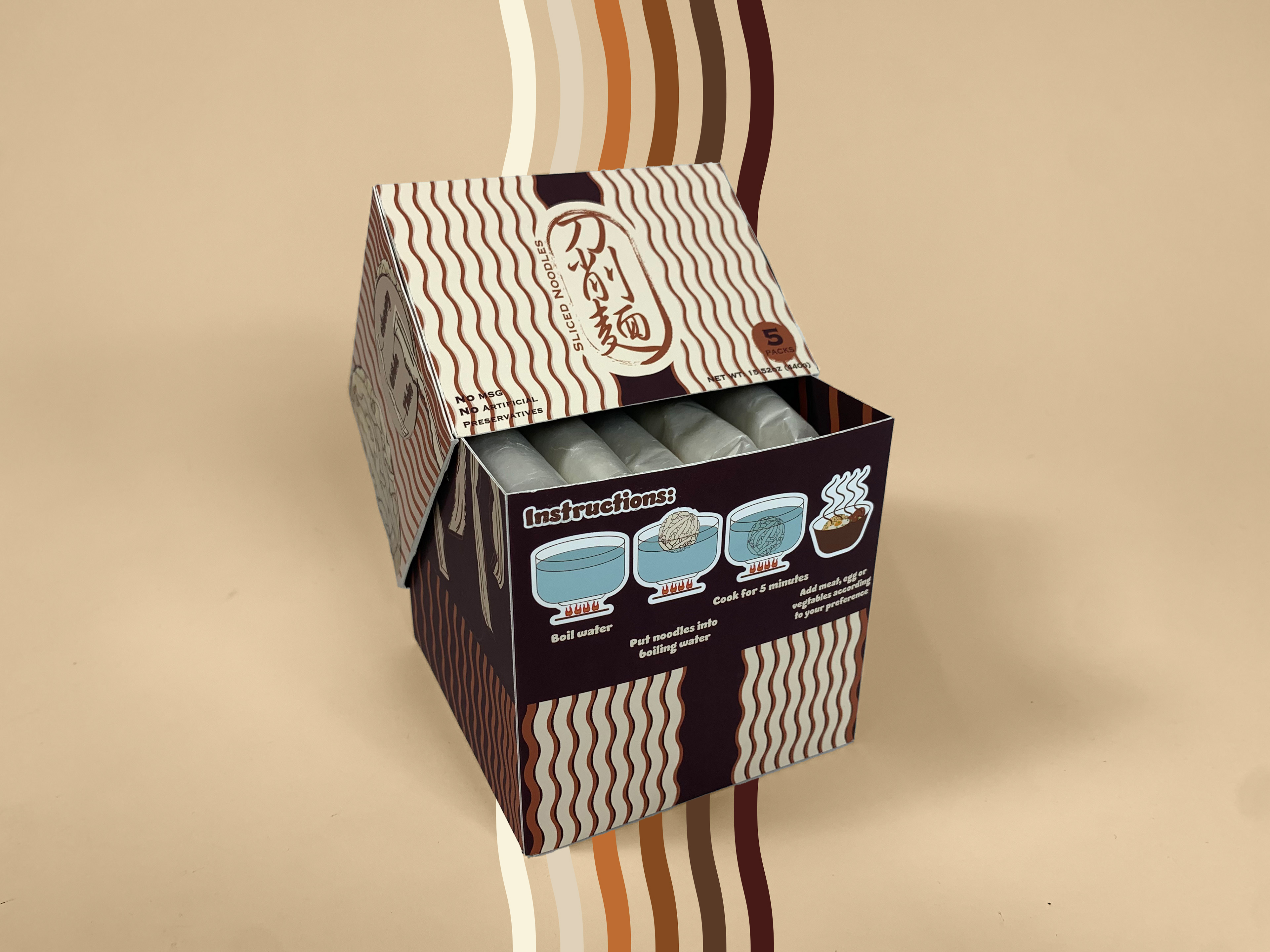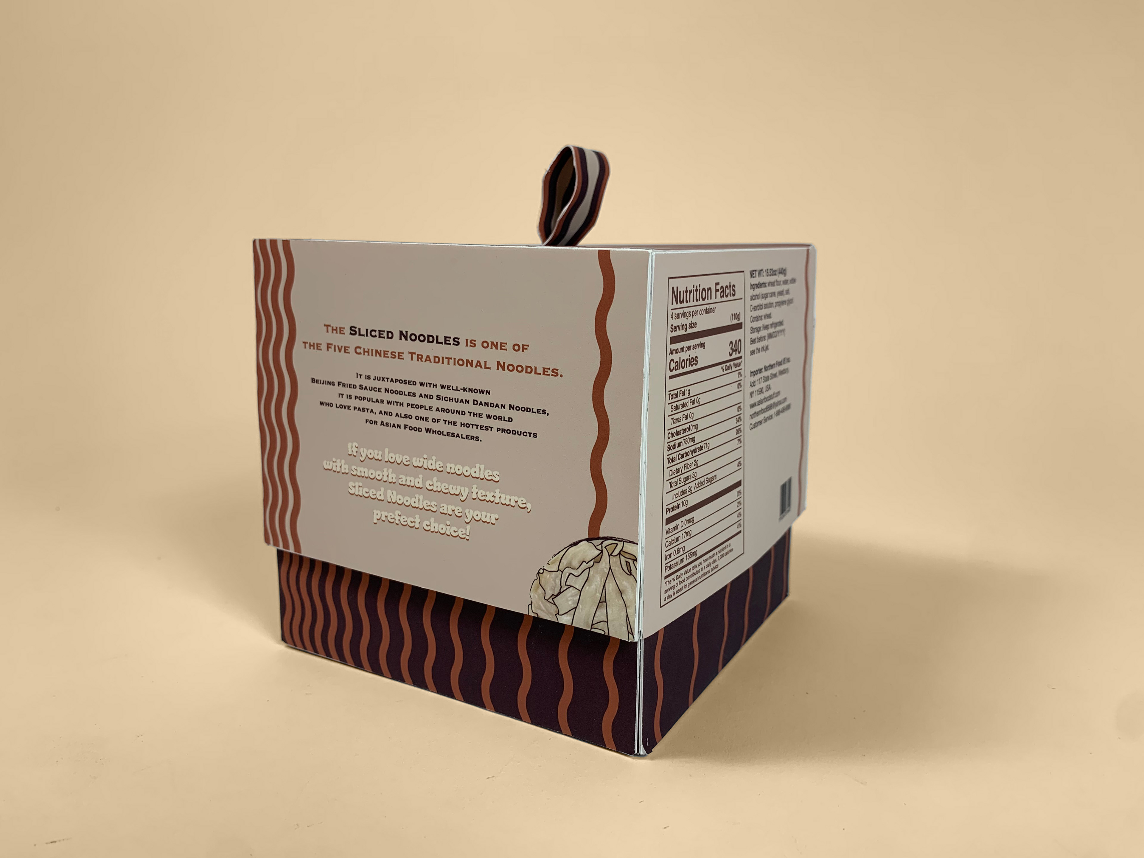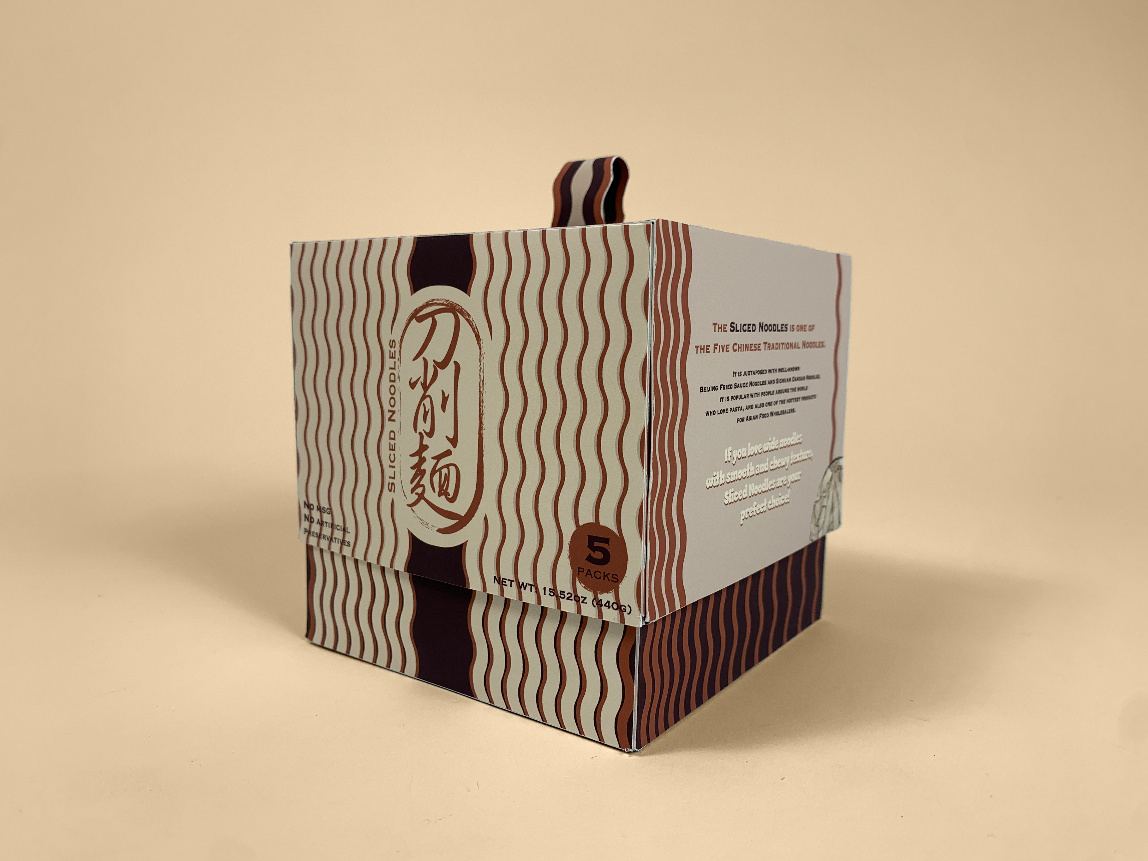 Chinese traditional sliced noodles use a knockdown box format to communicate with buyers. The whole design is surrounded by the shape of abstract noodles that aligned in various ways. The use of colors is also relevant to the food.