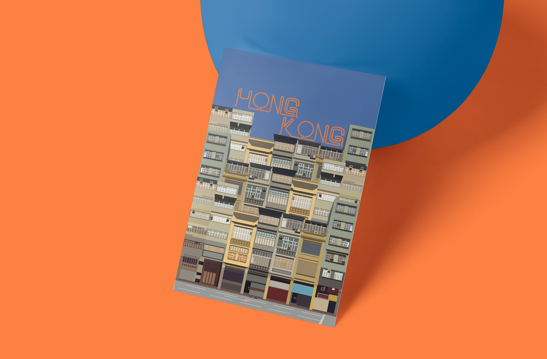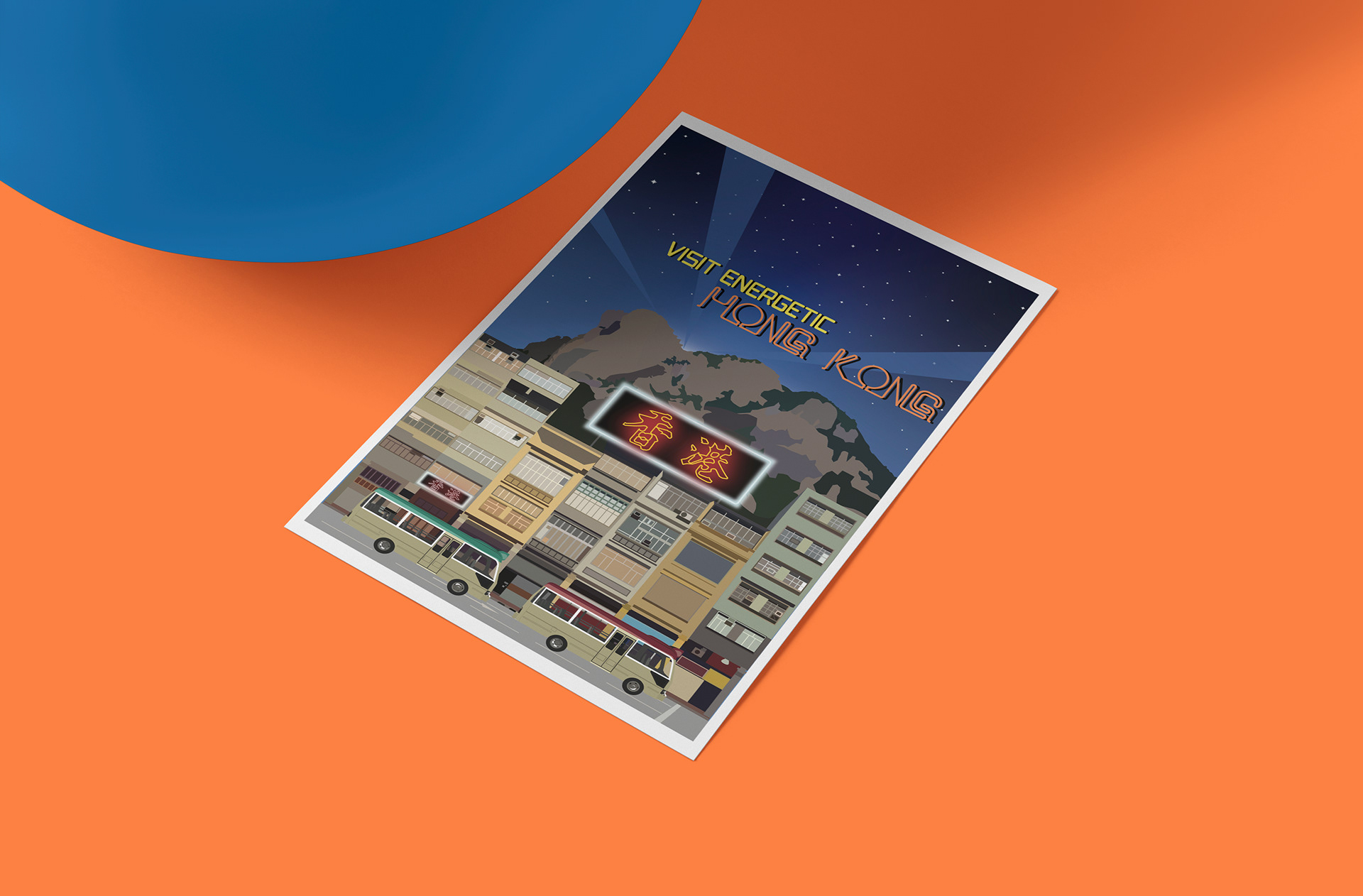 A Poster of an energetic city, Hong Kong. This place has an iconic skyline, rich cultural heritage, and a dynamic economy. And I used some famous objects like the Lion Rock, Tong Lau (tenement buildings), neon lights, and buses to represent it.